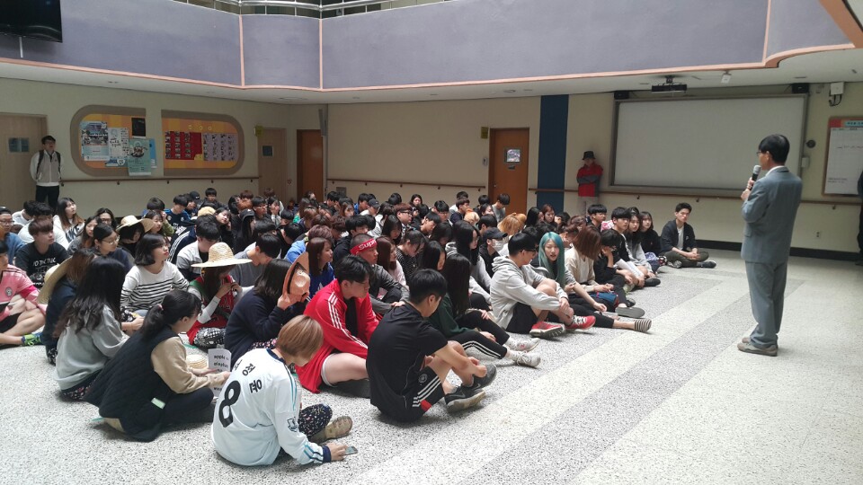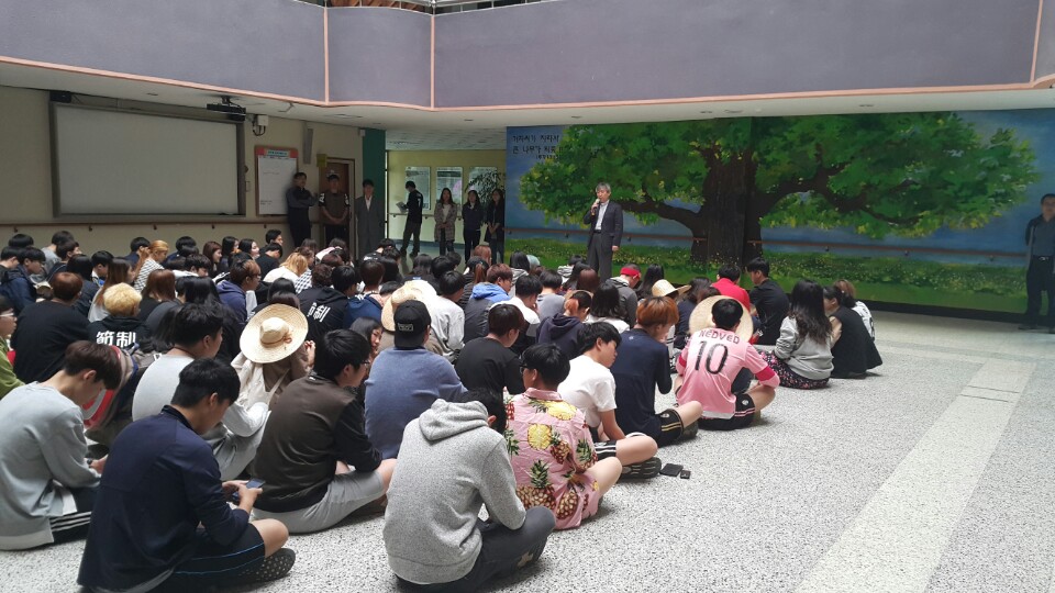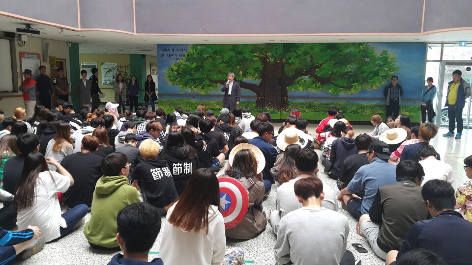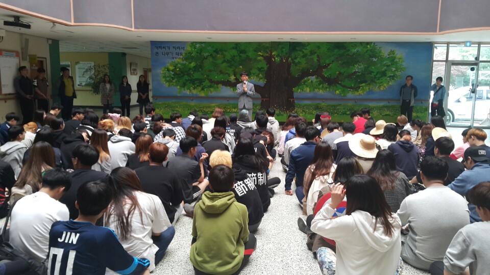 이제 봉사활동지로 출발전 양업고 전 가족이 중앙홀에 모여