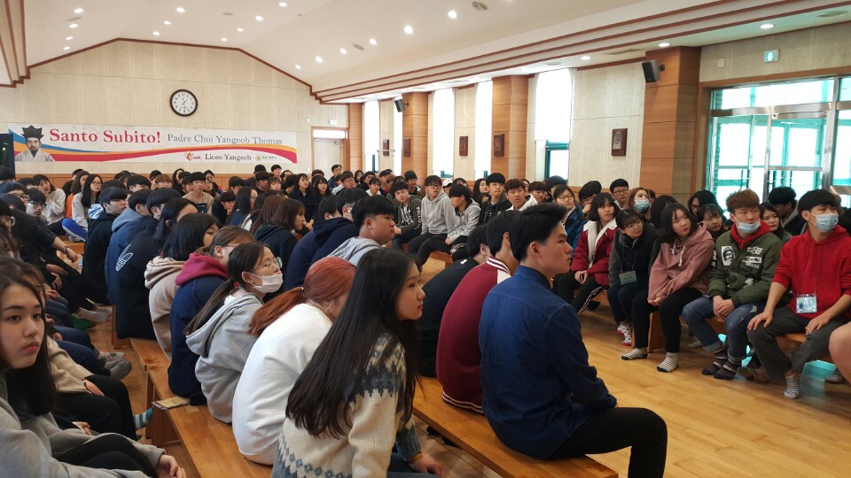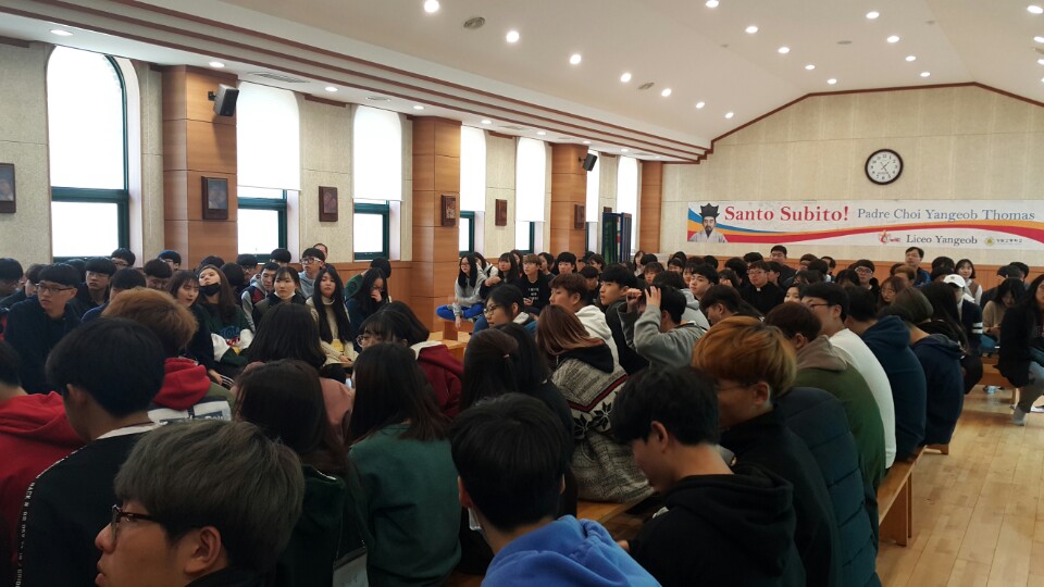 좋은학교 양업에서 전체회의는 교장신부님, 교감선생님, 모든 선생님과 전교생이 한자리에 모여