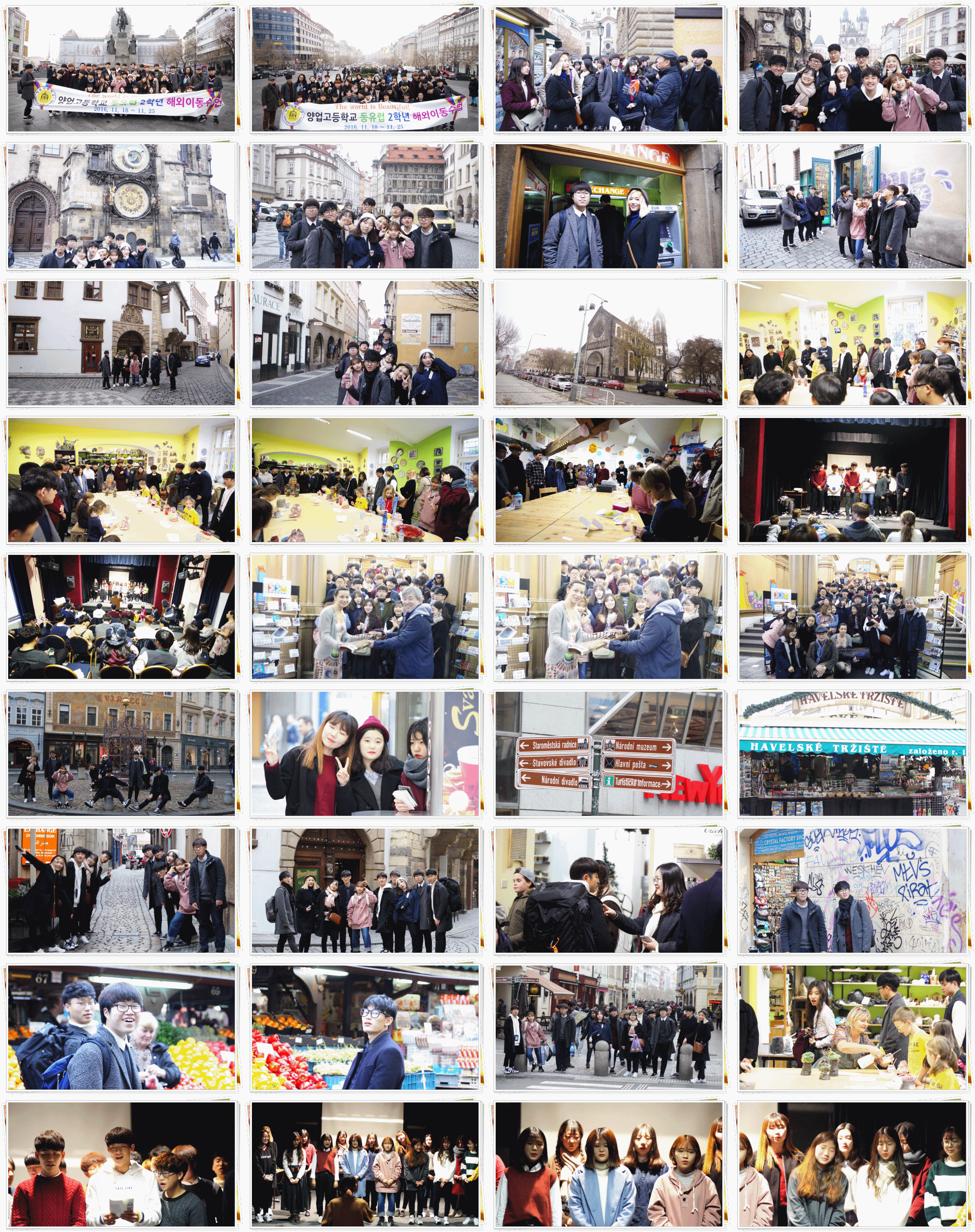 오늘은 많은 친구들이 기다리던 자유시간이 있는 날이었습니다. 각자 체코돈(코로나)으로 환전도 해보고, 많은 선배들이 추천해준 마뉴팍트라에서 선물을 사기도 했습니다. 또, 하벨 시장을 거닐면서 다양한 기념품들을 샀고, 체코의 아름다운 낮 모습을 눈에 담았습니다. 점심시간엔 1인당 지급된 돈으로 음식을 주문해보는 경험도 해볼 수 있었습니다. 자유 시간 후 프라하의 방과 후 학교를 방문해서 학교 설명을 들은 후 견학을 했습니다. 문화교류시간을 가지기도 했는데 18기 친구들이 열심히 준비한 무대를 그곳 아이들과 함께 나눌 수 있었습니다. 비록 준비한 만큼 보여주진 못했지만 최선을 다해 준비한 18기 친구들 서로가 서로에게 자랑스럽고 고마운 시간이었습니다. 아쉽지만 예쁜 아이들과의 시간을 마치고 다시 프라하 구시가지 쪽으로 이동을 했습니다. 저녁을 먹지 전까지 다시 한 번 자유 시간을 가졌는데요, 프라하에서의 마지막 자유시간인 만큼 친구들은 아름다운 프라하의 모습을 조금 더 담기위해 분주했습니다. 많이 걸어서 피곤하고 힘든 하루였지만 친구들 모두 즐겁게 마무리를 한 후 이동수업 넷째 날을 마쳤습니다.