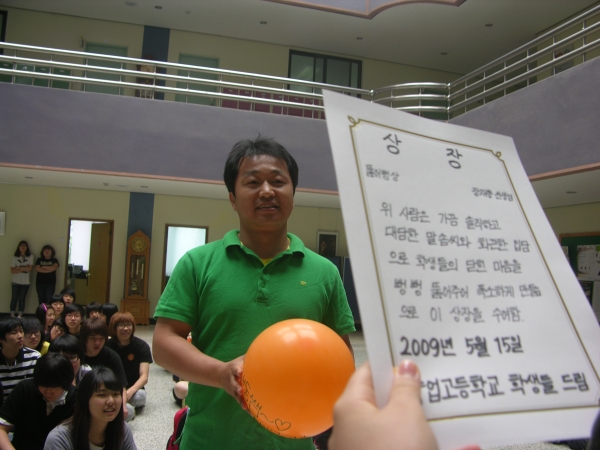 위사람은 가끔 솔직하고 대담한 말솜씨와 화끈한 입담으로 학생들이 닫힌 마음을 뻥뻥 뚫어주어 폭소하게 만듦으로 이에 상장을 수여함