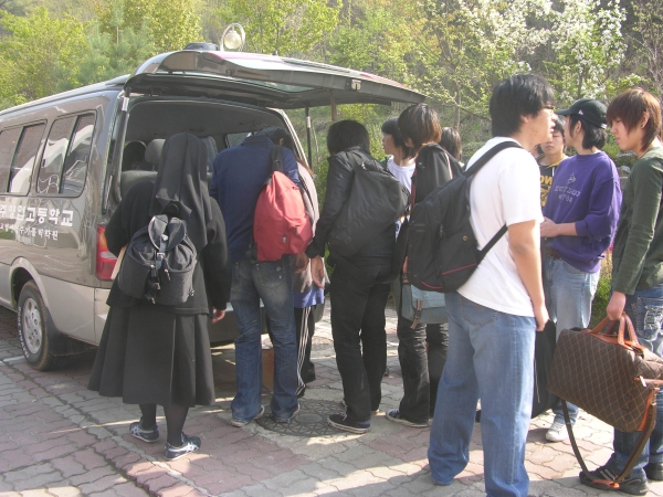 낫과 삽을 준비해서 가는 도안공부방 봉사활동 학생들...
