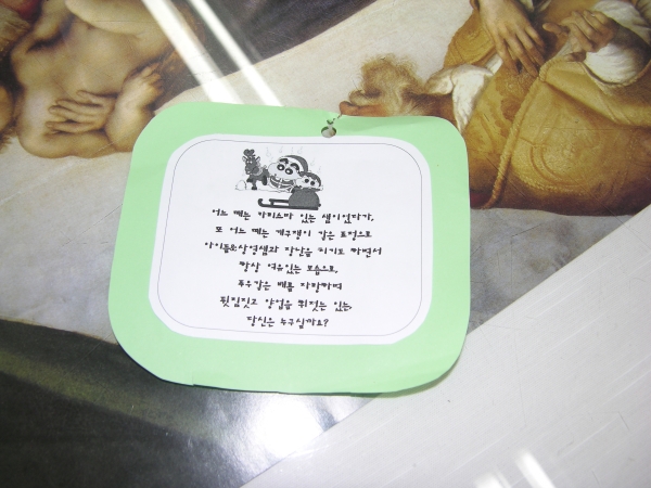 어제 성탄을 맞이하여 마니또 선물을 교환하였답니다. 선물에 이름은 없지만 메모가 적혀있었어요. 누구를 지칭한 것인지? 함 알아맞추어 보세요~