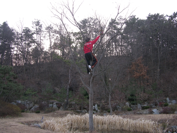 3학년 승호가 연못가 느티나무에 새장을 만들어 올려 놓았다.