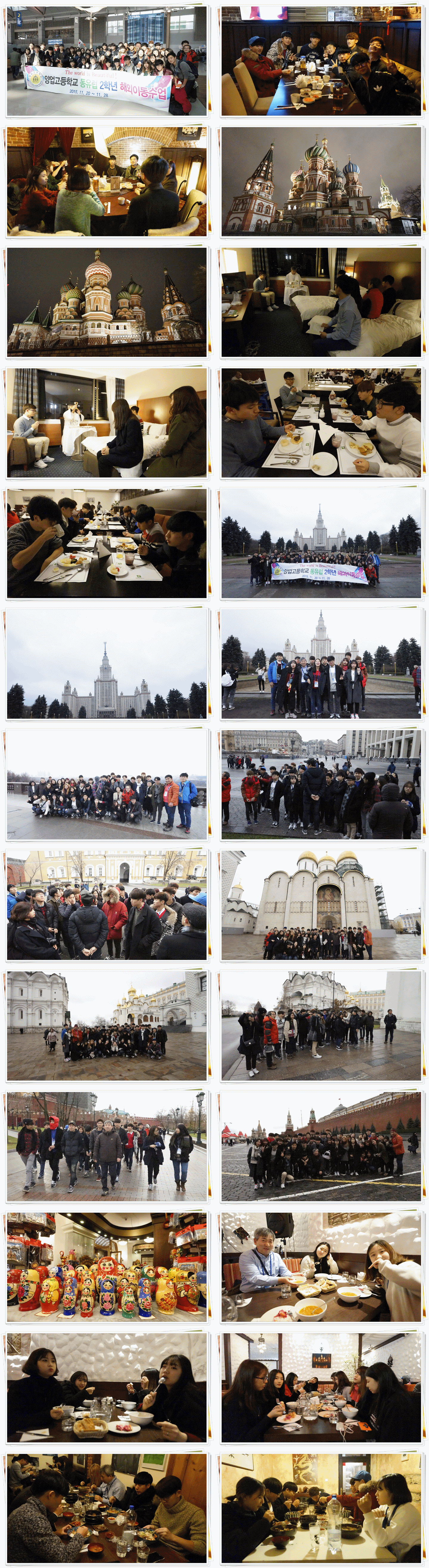 우리 친구들의 한국에서 모스크바까지의 9시간의 비행시간을 보내는 방법은 모두 제각각이었어요. 잠을 자는 친구들, 영화를 보거나 노래를 듣는 친구들, 책을 읽는 친구들... 하지만 모두 설레는 마음은 같았을 거에요! 기내식은 두 번 나왔는데, beef&fish 중 선택할 수 있었어요. 전체적으로 모두 맛있었다고 해요. 비행기에서 내리고 짐을 찾아 버스에 탔어요. 가이드 분의 굉장한 말솜씨 덕분에 창밖으로 모스크바를 구경하며 즐겁게 저녁 먹을 식당으로 갔어요. 저녁 메뉴는 순두부찌개였어요. 두 번 중 한 번의 한식인 식사를 마치고, 저희가 묵을 호텔로 갔어요. 짐을 풀고 반끼리 모여 일지를 쓴 뒤 오늘 하루를 마무리 했습니다.