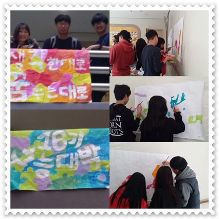 중앙홀에 붙여진 커다란 종이에, 3학년 학생들이 갖가지 색을 칠하는 작업이었습니다.
