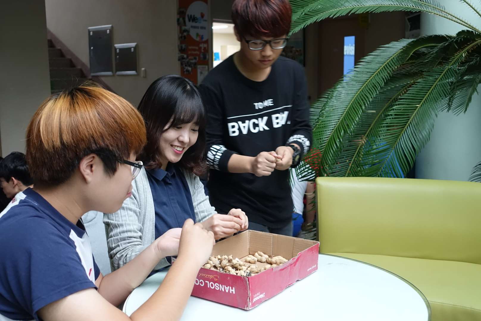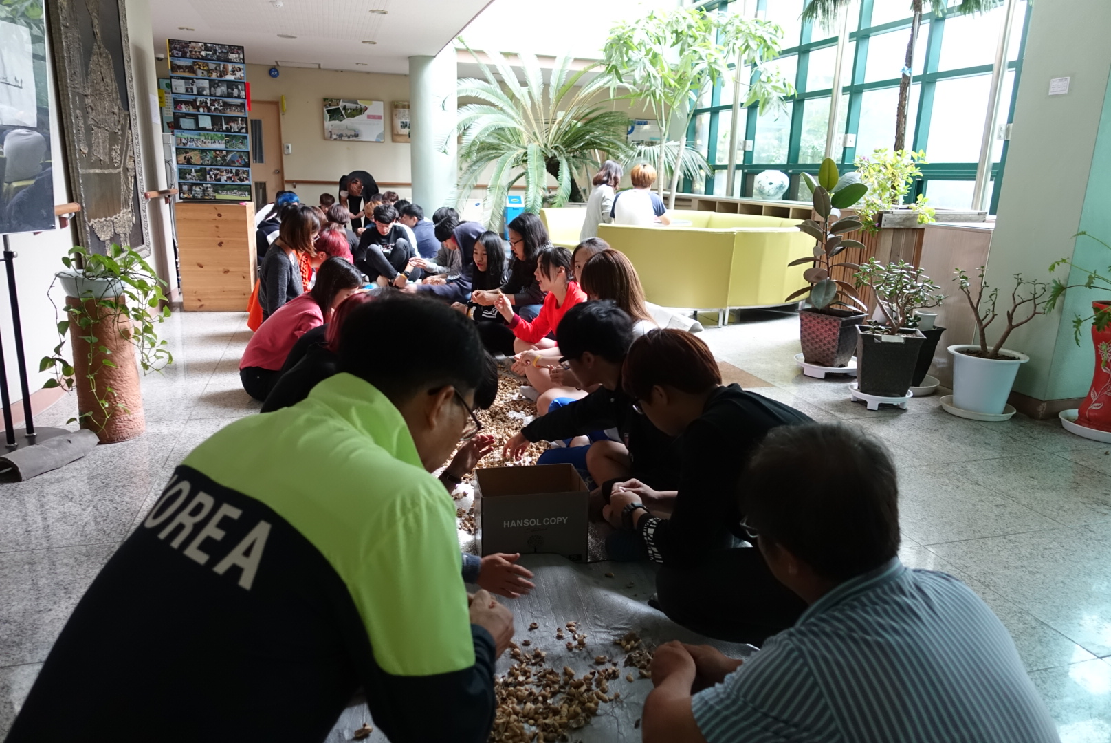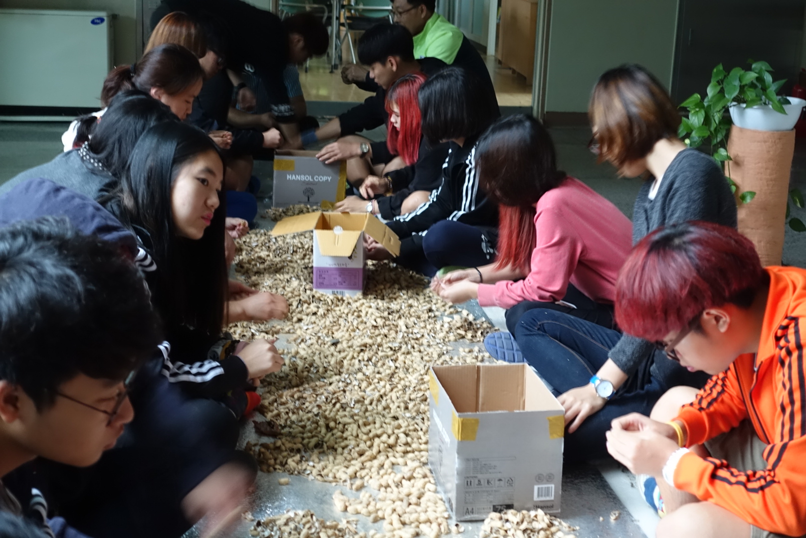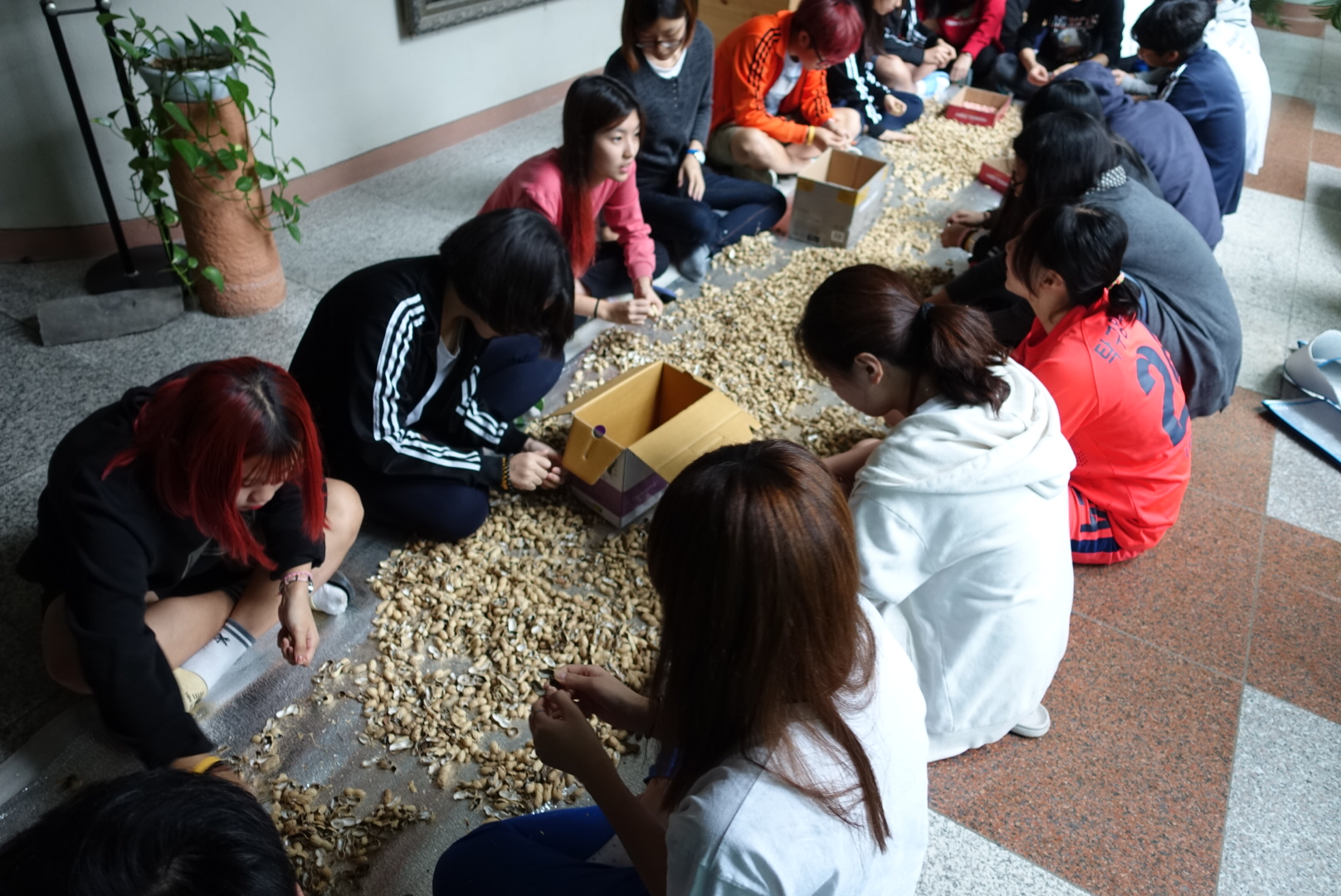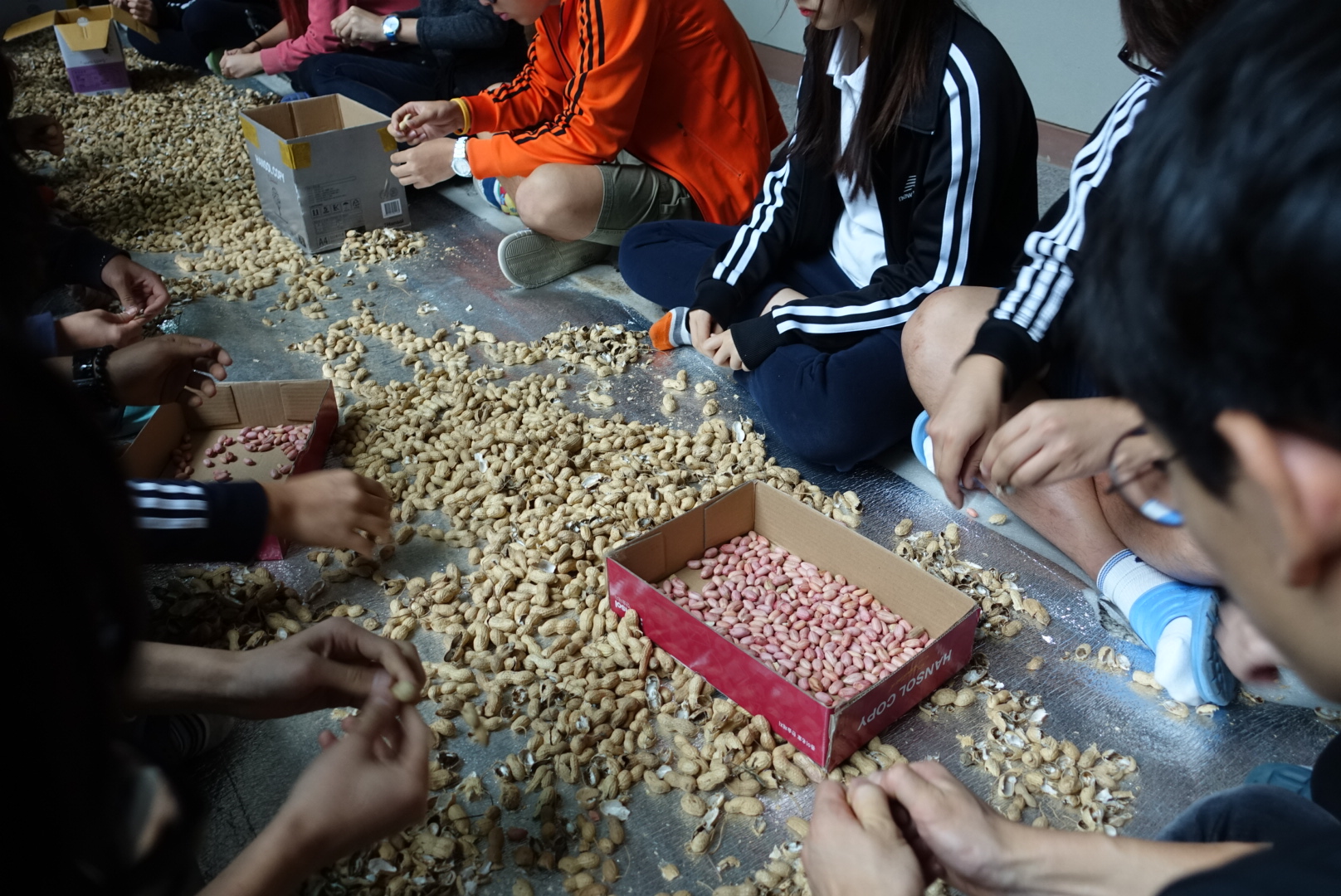 비가 와서 실내에서 수확한 땅콩 껍질을 까기로 했습니다.
