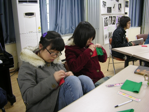 종교 시간에 성탄 향 주머니를 맹글고 있어요