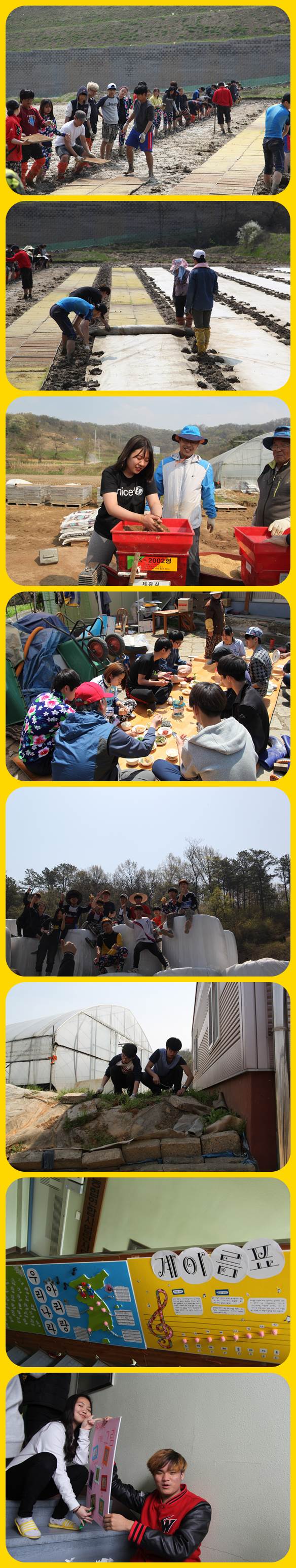 2015년도 양업고등학교 봉사활동이 4/22-23에 진행되었습니다. 괴산, 진천, 옥산 일대의 농촌봉사활동을 하고, 청주권 어린이집과 옥산지역아동센터에서도 아이들을 위한 수업과 게시판 꾸미기를 했습니다.