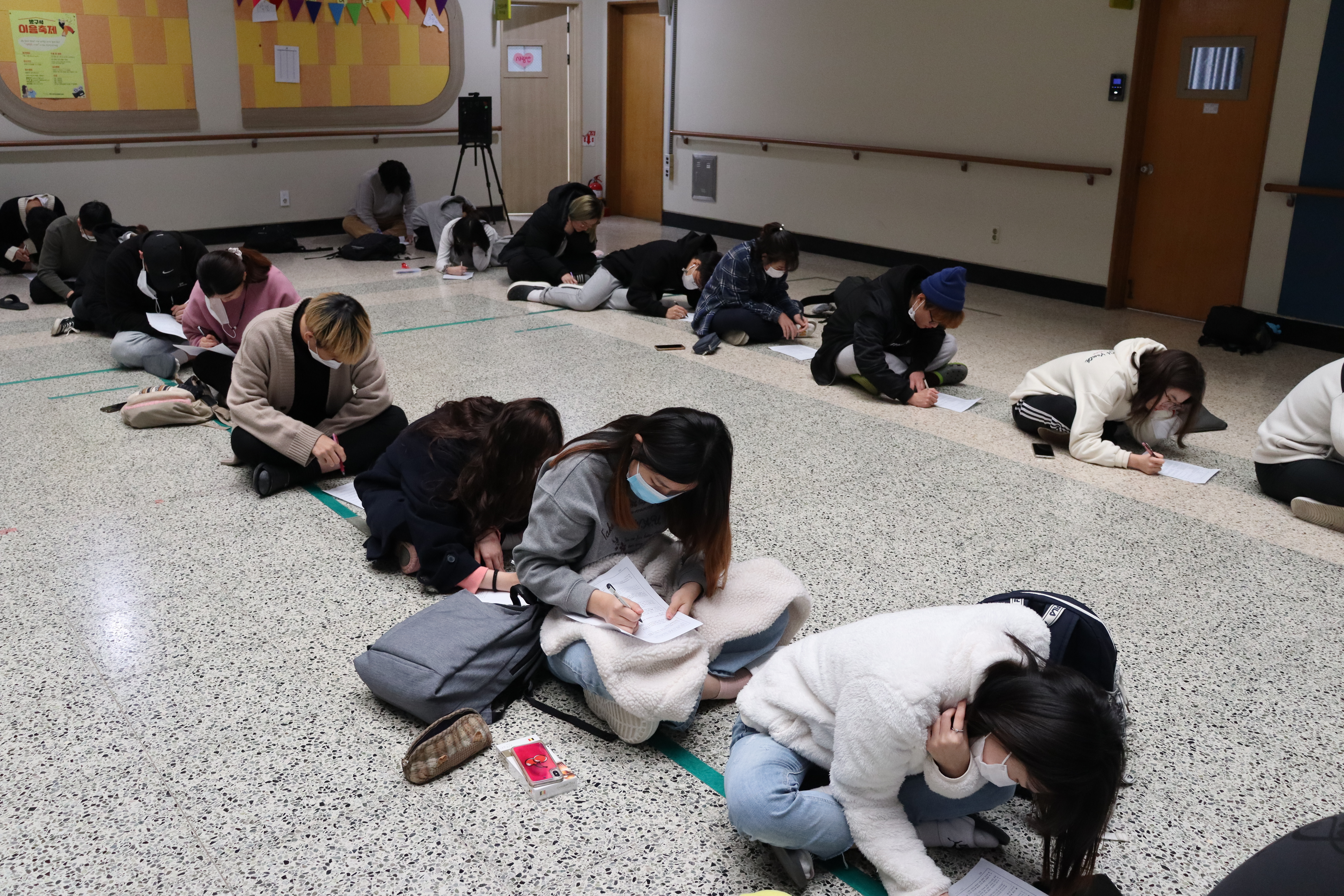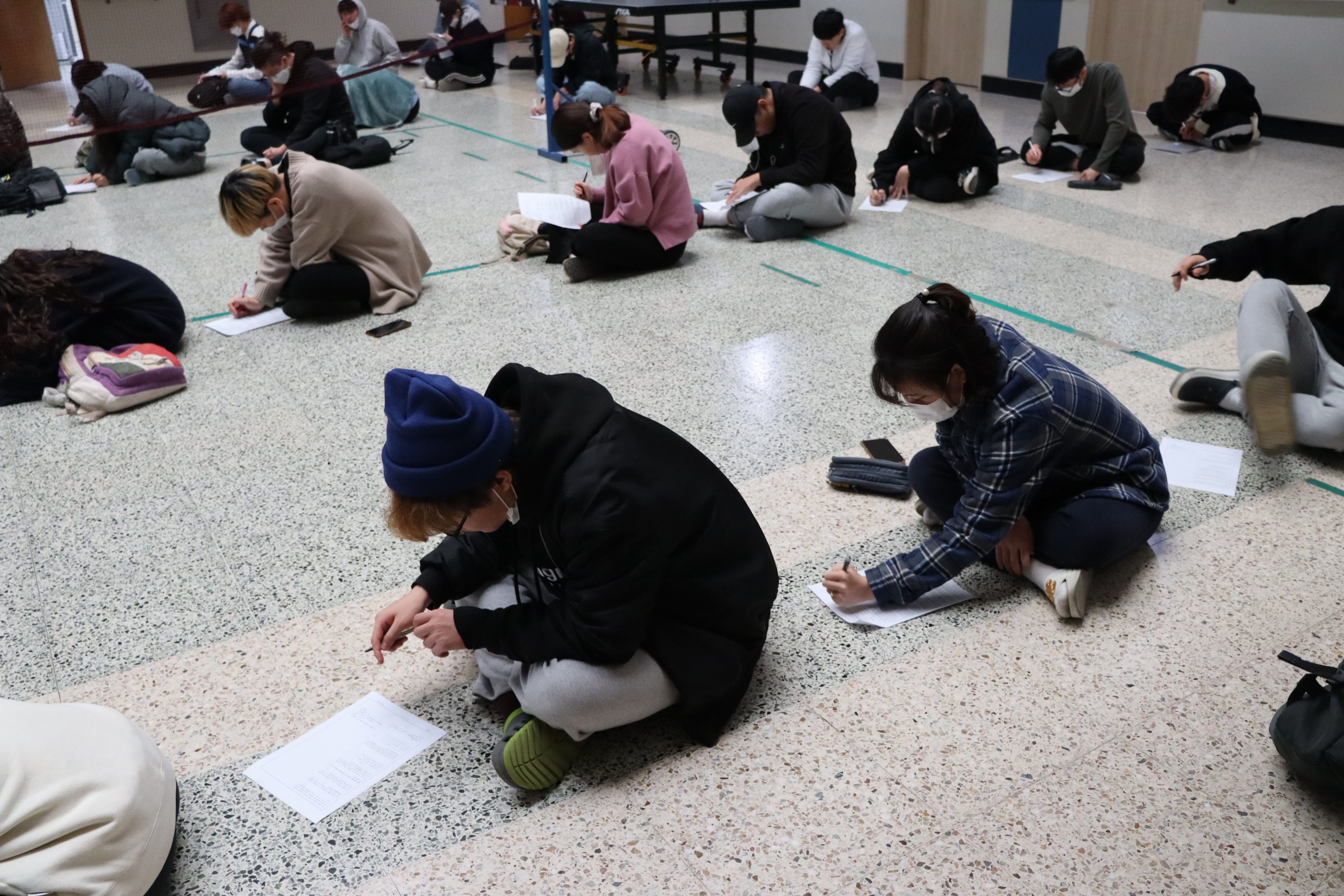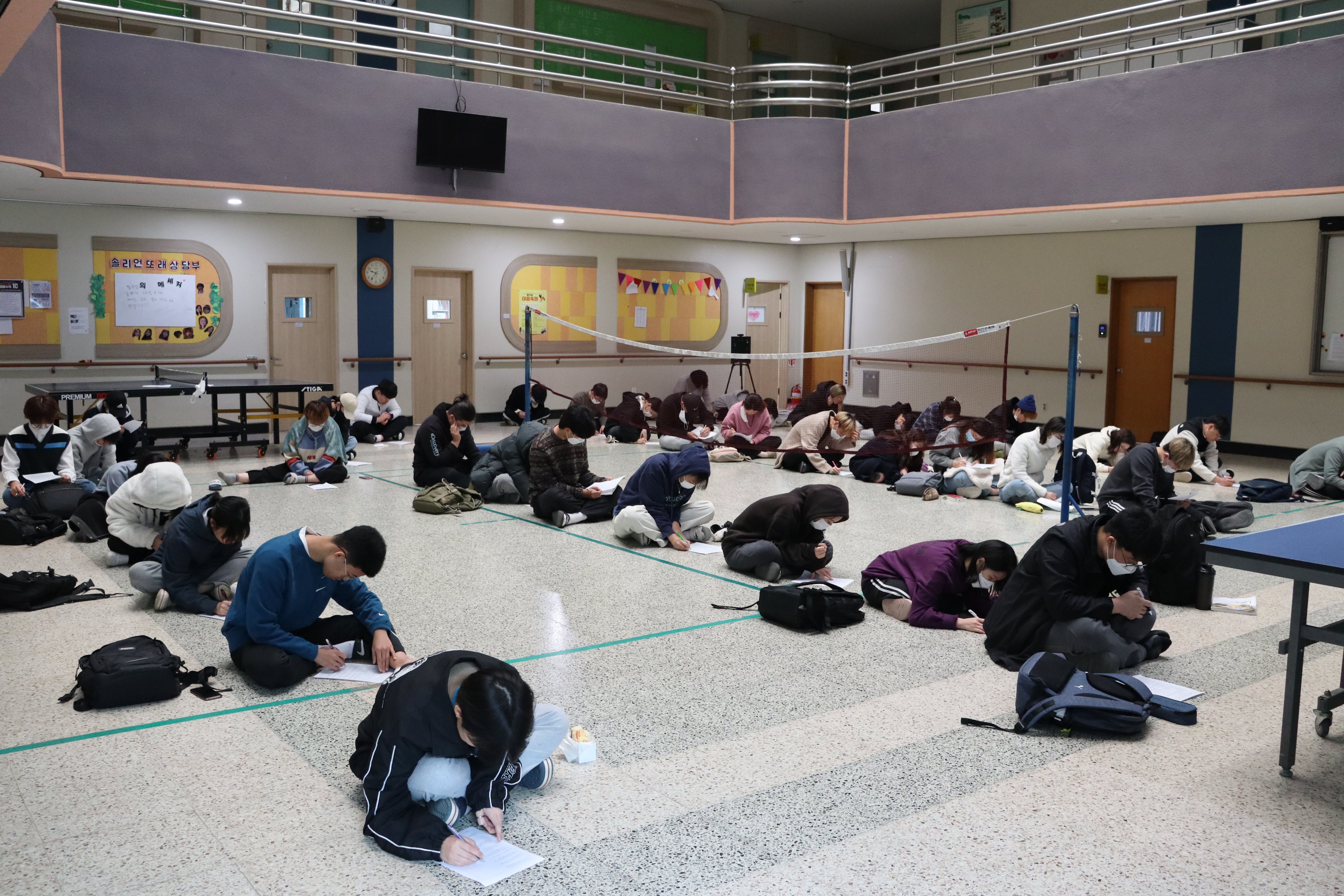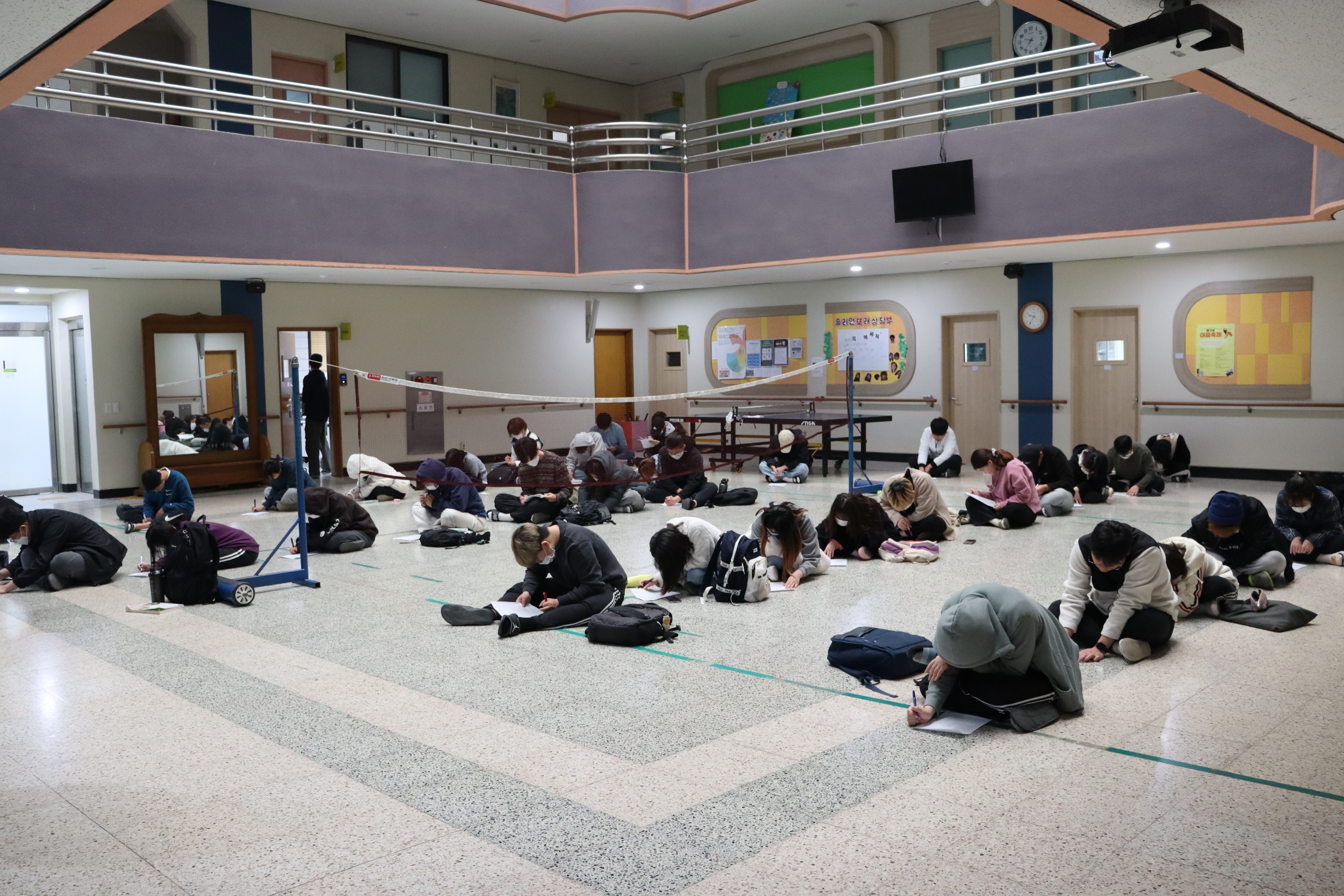 중앙홀에 다들 앉아서 1, 2반 동시평가를 진행 중이네요.
