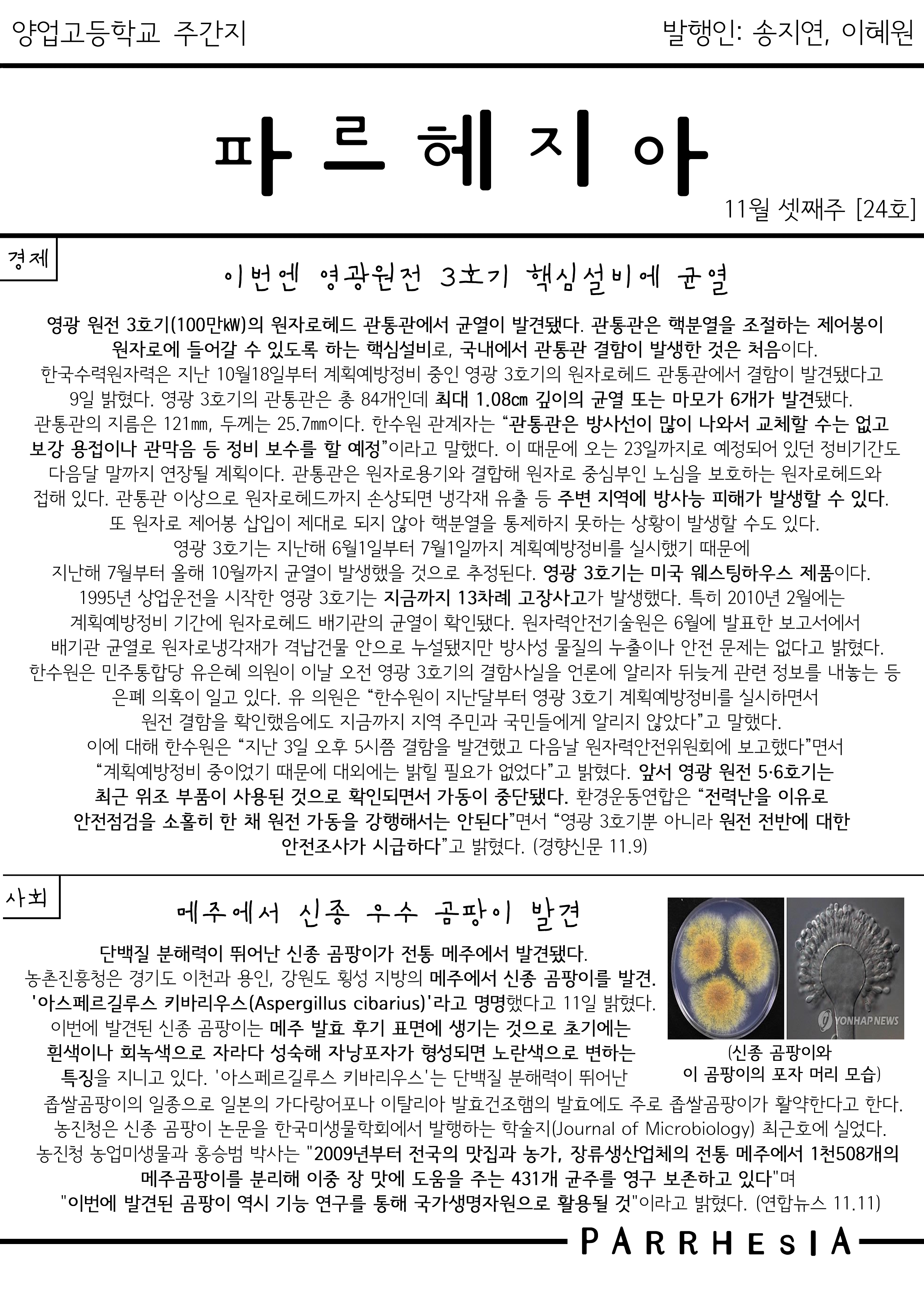 이번 호 마지막장에는 '투표시간연장'에 대한 양업인들의 생각을 알아보는 공간을 마련했습니다! 다음 주 파르헤지아에 결과를 싣도록 하겠습니당 ^ㅇ^