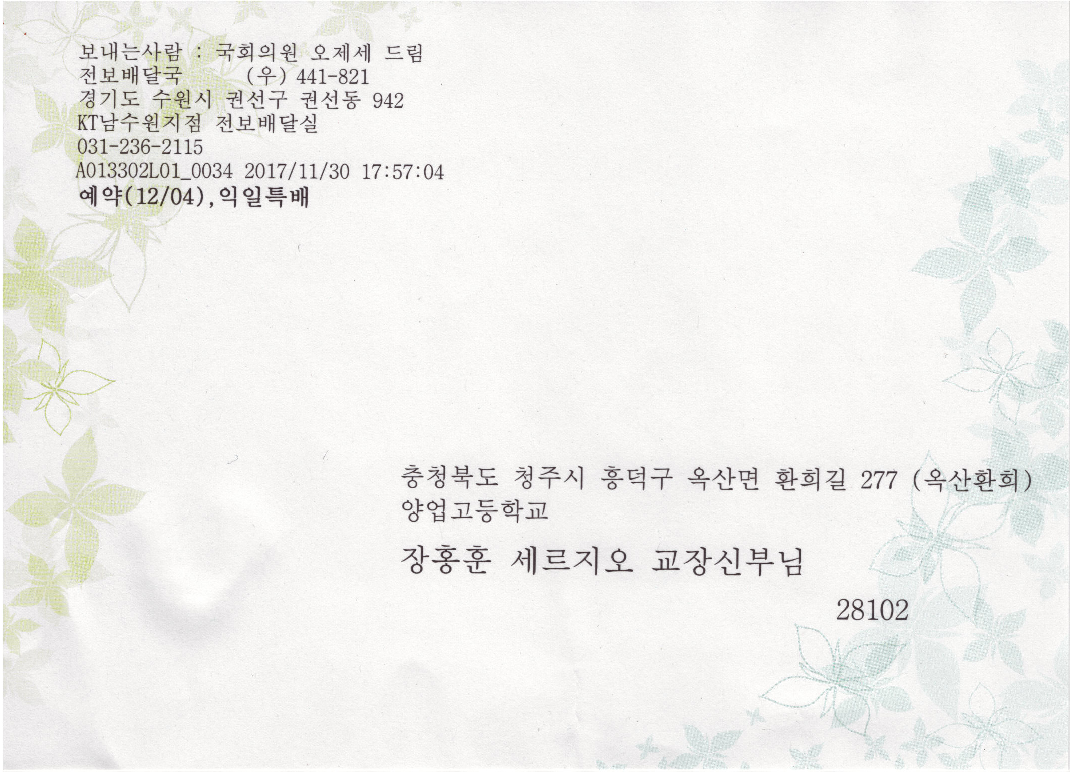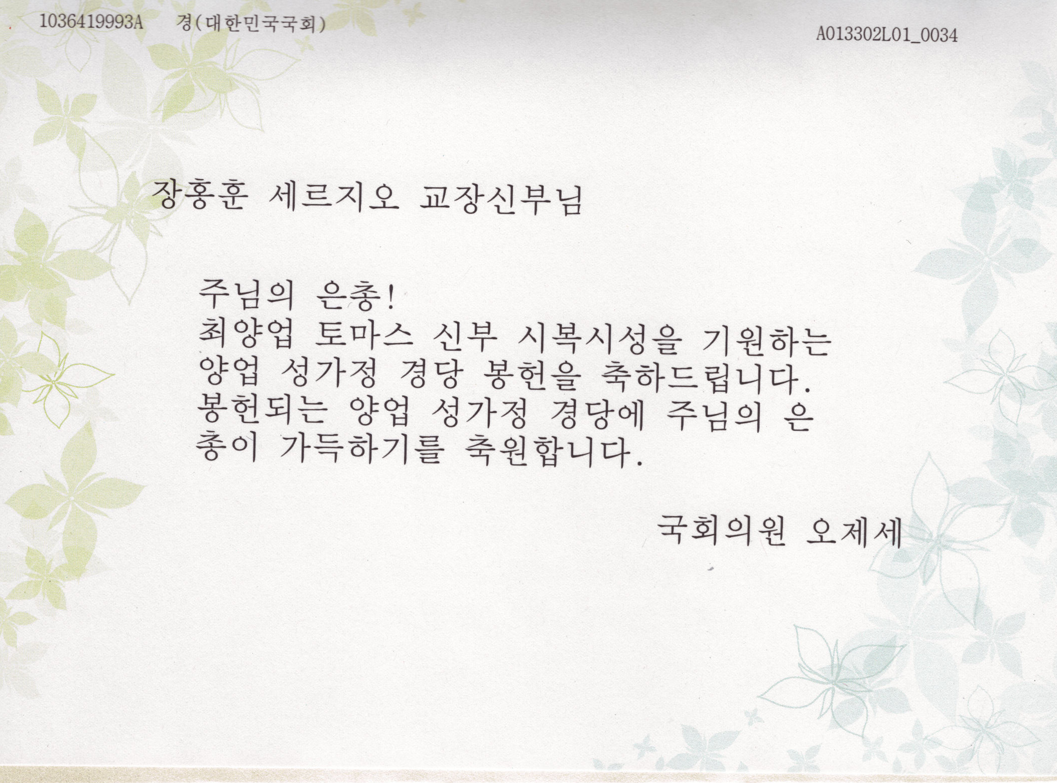 그리고 국회 오제세 의원님께서 축복식 축전을 보내주셨습니다.