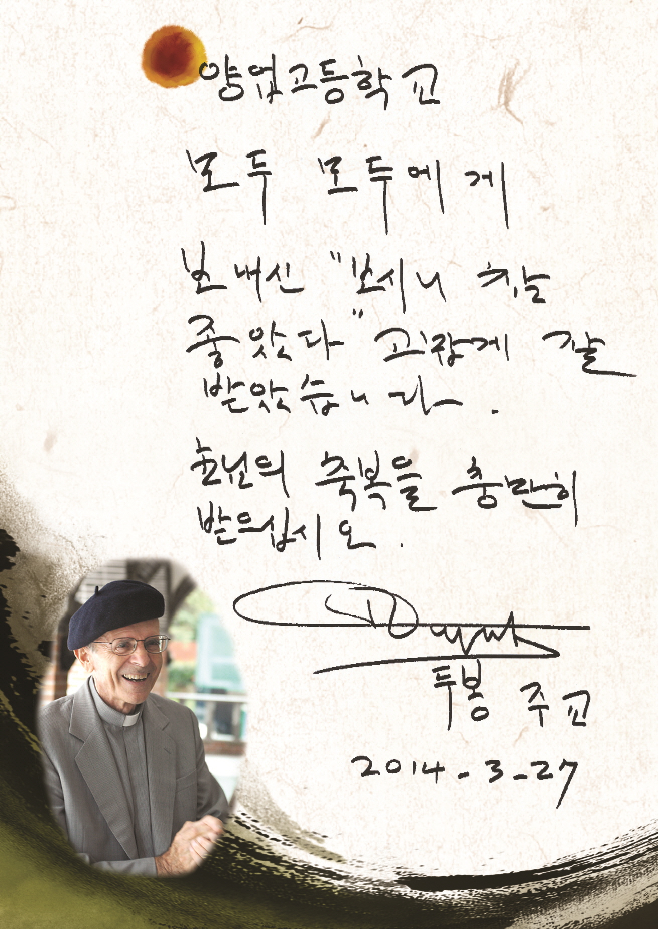 보내드린 책자를 보시고 두봉 주교님께서 우리 학교와 양업 가족들에게 감사와 축복의 메시지를 보내주셨습니다.