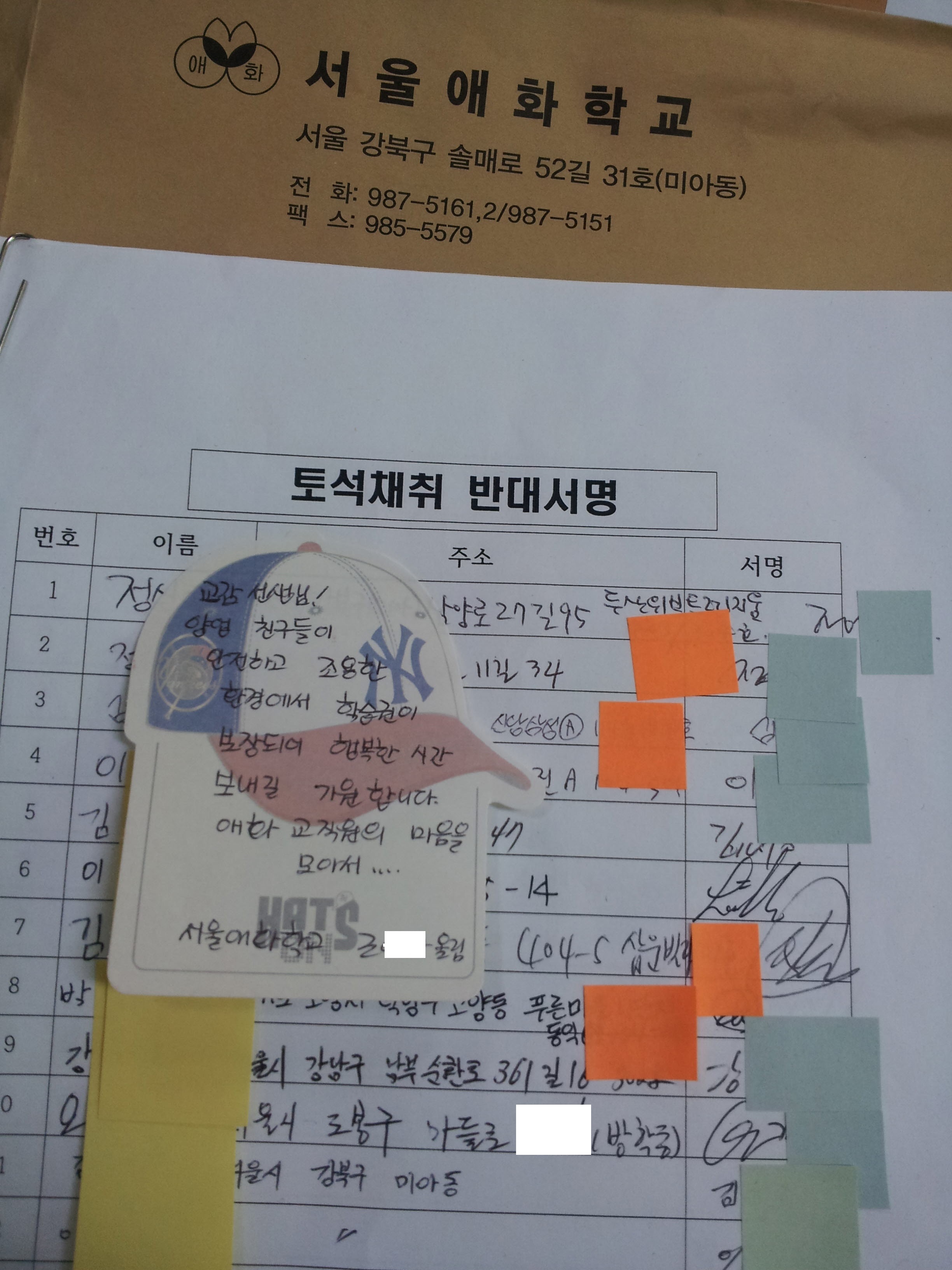 "서울애화학교"에서 '토석채취 반대 서명지'에 직접 서명하여,