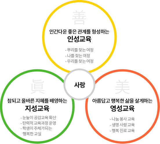 - 내적통제를 통한 자발성과 자기주도성 고양 - 교사의 전문성 강화를 통한 건강한 교사상 정립 - 학생자치능력 신장을 통한 학교문화 선진화 - 학부모교육 활성화를 통한 교육공동체 관계 증진 |